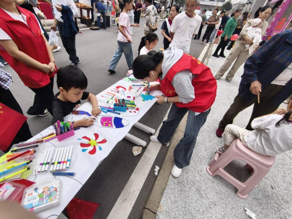 活动现场还设置了有奖问答环节,志愿者们精心准备了与国家历史、文化相关的题目,居民们积极参与,成功答对问题的居民获得了精美小礼品。此外,志愿者们还协助社区开展特色活动,耐心指导社区小朋友们参与“共画一幅画”项目,用画笔描绘出对祖国的美好祝愿。