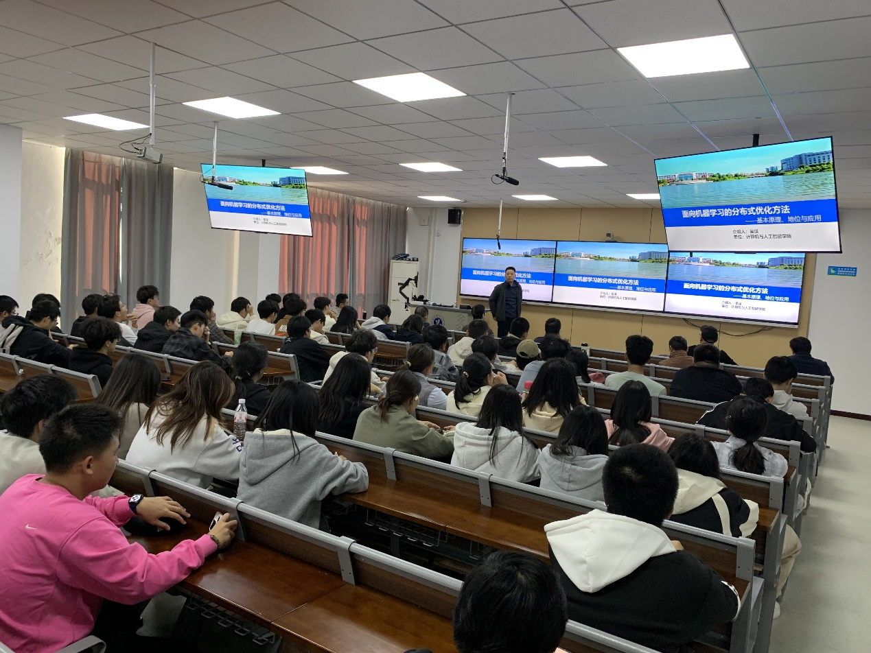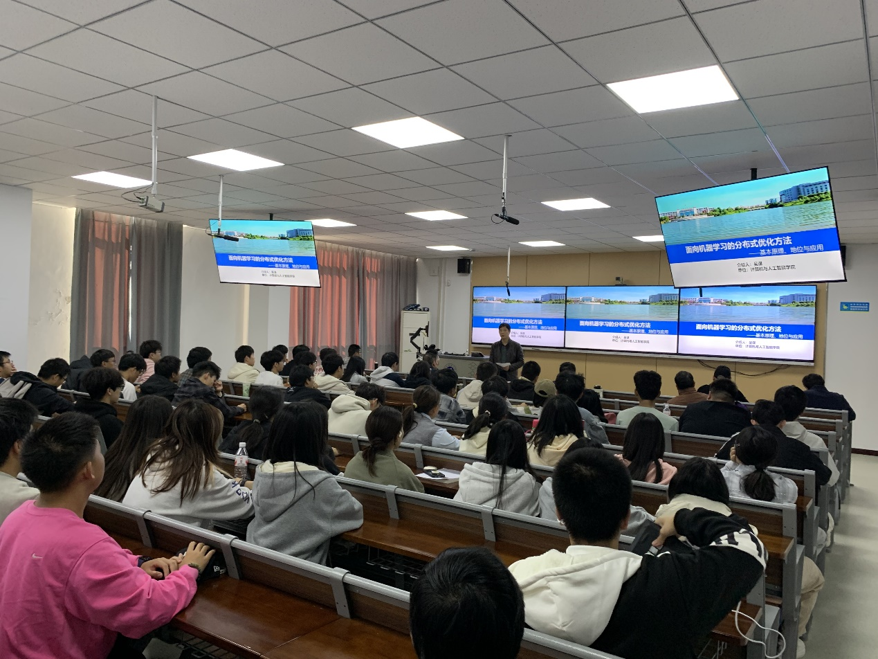 吴谋博士以《面向机器学习的分布式优化方法》为题作学术报告。吴谋副教授为天津大学计算机科学与技术博士后,IEEE及CAAI会员,湖北省高等学校优秀中青年科技创新团队负责人,主持多项省部级科研项目,发表SCI论文20余篇,主要从事机器学习分布式算法、联邦学习与多智能体网络研究。 报告中,他系统阐述了分布式优化的基础理论与前沿进展,重点分析了其在处理大规模数据、复杂模型训练中的关键作用,并就通信效率、系统一致性等核心挑战提出了具有启发性的解决路径。深入剖析了系统架构、共识一致性等关键挑战,并介绍了参数服务器、联邦学习等前沿解决方案。